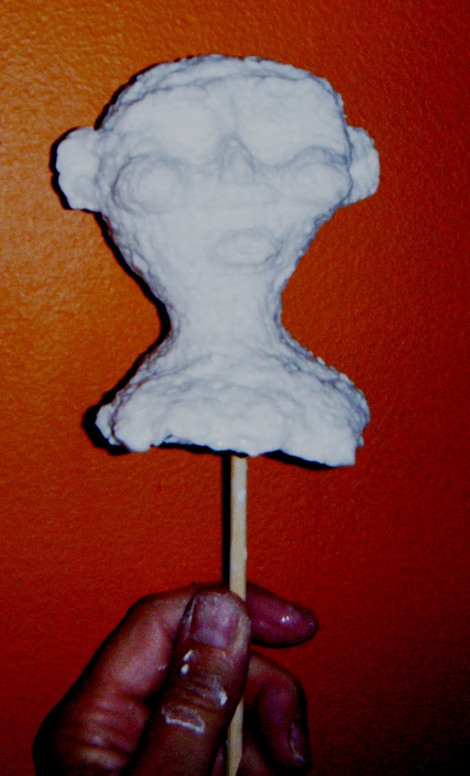 Well, it took nearly four days for the head to dry properly. I was excited to sand and smooth the face but it turns out that even the coarse sandpaper won't do the trick on Claycrete. I guess I kind of knew that as I was sculpting because there were far too many wrinkles that couldn't be smoothed out. I've since perused the craft store and believe I'll give a different medium a go. I'm wary of clay though as I'm not a big fan of trying to bake it.